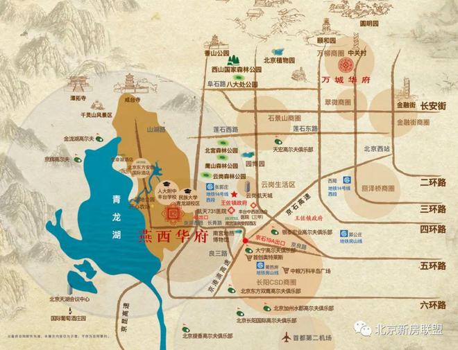 燕西华府位于丰台区王佐镇,青龙湖板块(青龙湖公园东500米),坐拥“一环三快”(西六环、京良、莲石、京港澳快速路)高速交通网,15分钟到石景山,28分钟到金融街,30分钟到公主坟,35分钟到万柳,40分钟到达。